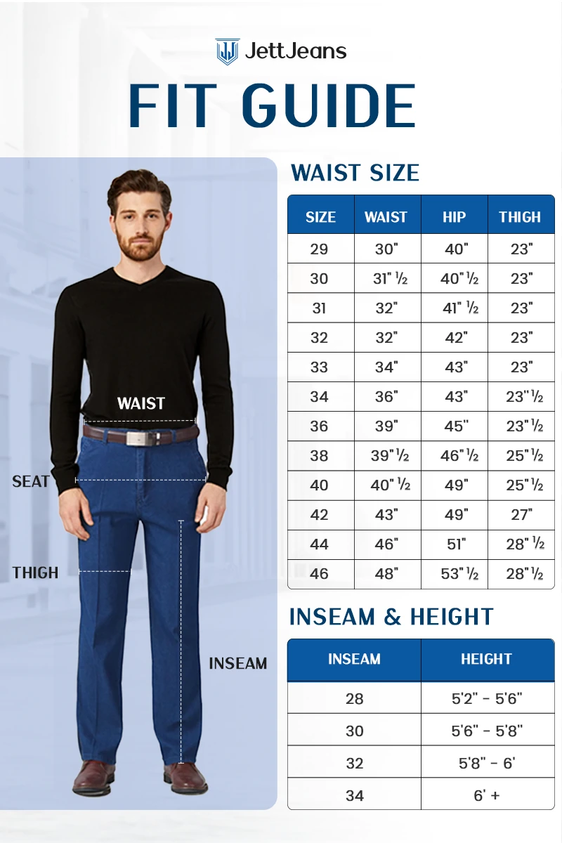 The Perfect Look begins with the Perfect Fit. Please follow this size guide below to choose your perfect fit with JettJeans.